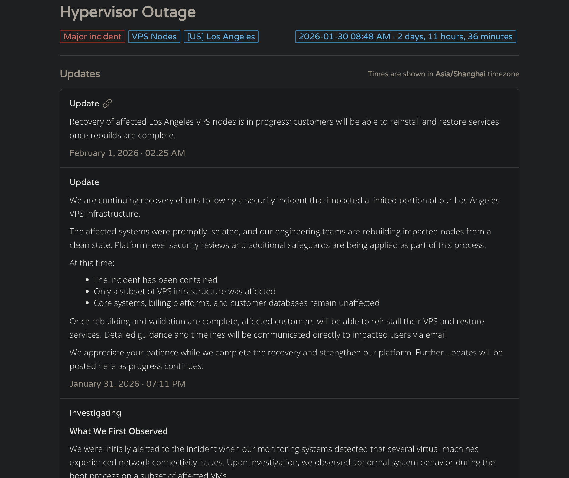 CloudCone机房罕见的出故障了,因为虚拟机WEB控制面板 Virtualizor 上存在一个严重漏洞,本来还准备在周末在CC服务器上整个mjl-/mox,结果什么也干不了。